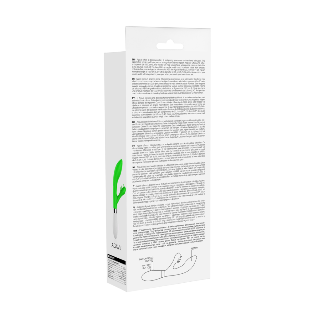 Agave biedt een heerlijk extraatje: 4 prikkelende extensions op de clitorisstimulator. Dezevibrator in rabit-style neemt je mee op een prachtige reis naar de hemel van een orgasme! Met10 verschillende snelheden (bij 5200 tpm!), Zal deze vibrator je zeker helpen om ongelooflijkplezier te bereiken. Met weinig tot geen geluiden (50DB) kan dit mooie speeltje veilig privéworden gebruikt. Deze toy is gemaakt van gladde, ftalaatvrije, medische siliconen en ABS. 6cm (1,4 ). Dus laat Luminous je wereld kleuren, en het zal sterren in je ogen brengen wanneerje je beste climax tot nu toe bereikt.