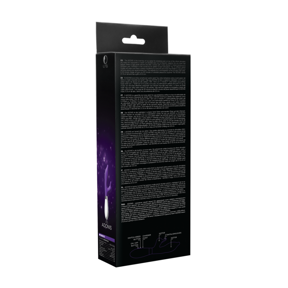 De ADONIS is de loverboy uit onze serie. Zijn prikkelende oortjes bovenop de clitoris stimulatormaken het onmogelijk hem te weerstaan. Laat ADONIS u naar hemelse orgasmes voeren, zoals uze nog nooit heeft beleefd. Gemaakt van hoogwaardig silicone en ABS. Wordt geleverd met 2 extrasterke F1 motoren met een toerental tot 5.200 omw/min en 15.000 omw/min in de gebogen puntvoor perfecte G-spot stimulatie! De 10 verschillende snelheidsmodi zorgen ervoor dat er altijd voor elkwat wils is en bij minder dan 60dB is niemand anders op de hoogte van uw geheime rendez-vous.Dit prachtige speelgoed is oplaadbaar via de meegeleverde USB-kabel. 30 minuten opladen geeftu 60 minuten ongebreideld verzadigend speelplezier! De ADONIS heeft een lengte van 21,8 cm eneen diameter van 3,5 cm.