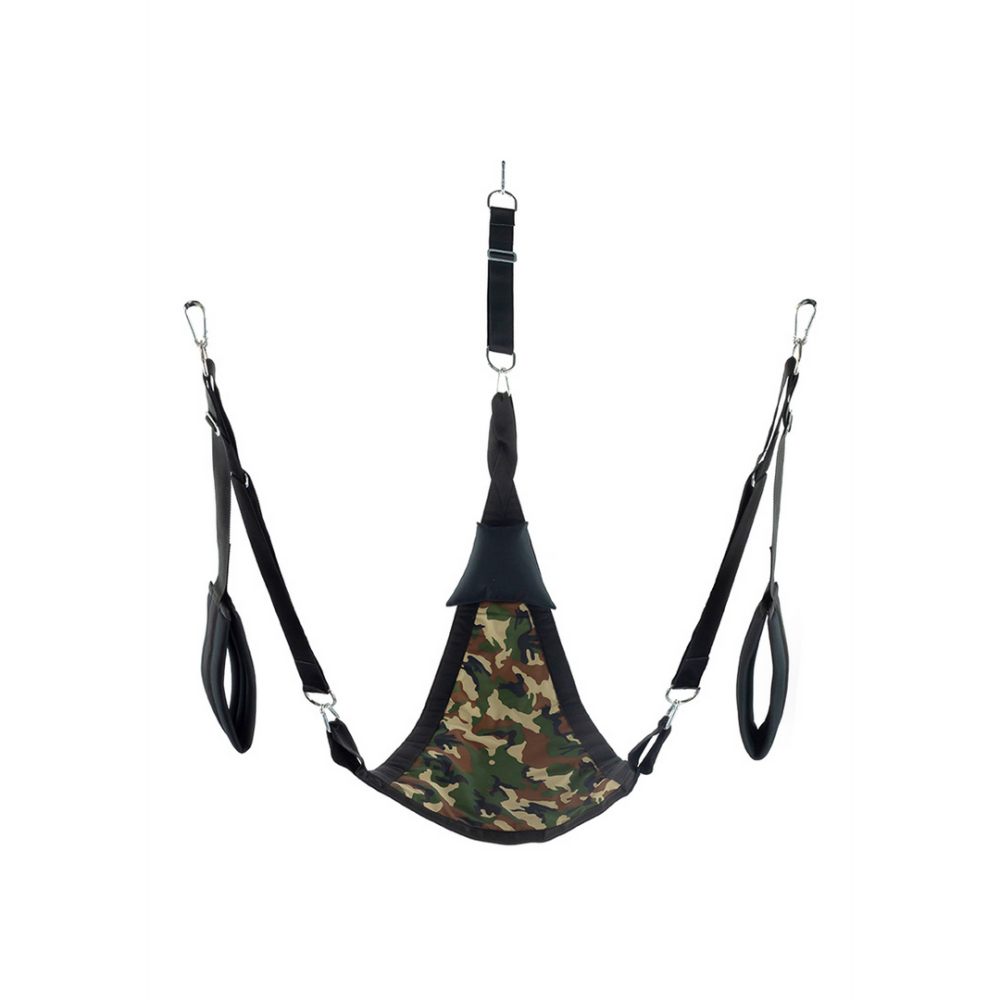 Deze Camo stof sling is ontworpen met een driehoekige vorm en Camouflage stof. Hij past met 3 of 4 bevestigingspunten. Het wordt geleverd met de accessoires: de 4 hangers met de metalen karabijnhaken / de gewatteerde voetsteunen (11cm breed) / de zwarte driehoek kussen (24 x 20cm) Materiaal: polyester gemaakt in Europa