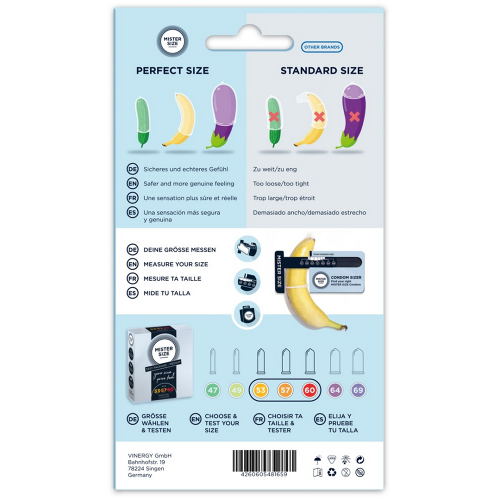 Het praktische formaat kit bevat de Condom Sizer, die je kunt gebruiken als een schuifmaat. Trek het uit elkaar en plaats het centraal rond de erecte penis. Nu kun je je aanbevolen maat aflezen van de pijl. Het bevat ook 3 condooms in 3 verschillende maten om direct je condoommaat te testen.