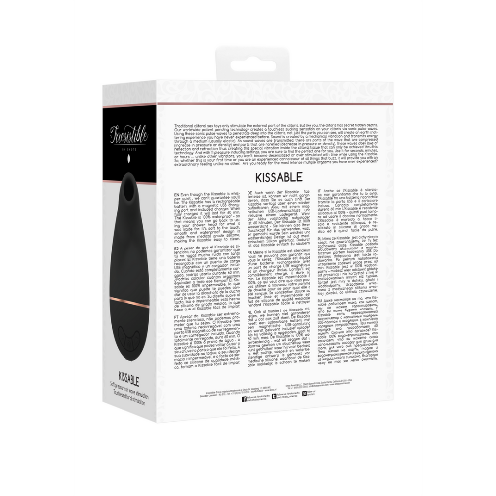 Ook al fluistert de Kissable stilletjes, we kunnen niet garanderen dat u dat ook zult doen. De Kissable heeft een oplaadbare batterij met een magnetische USB-aansluiting en wordt geleverd inclusief oplader. Als hij volledig is opgeladen, gaat hij 60 min. mee. De Kissable is 100% waterbestendig - wat wil zeggen dat u daarna gewoon uw douchekop weer kunt gebruiken waar hij voor bedoeld is. Het zachte, soepele en waterbestendige ontwerp is gemaakt van medische silicone, waardoor de Kissable makkelijk is schoon te maken.Touchless Airwave-technologieDe Irresistible Collection is niet zomaar een collectie seksspeeltjes. Ze zijn de beste seksspeeltjes op de markt voor vrouwen. Dat is een feit! Wat de Irresistible Collection zo bijzonder maakt is dat onze clitorisvibrator vervaardigd is uit hoogwaardige siliconen en dat hij uitgerust is met onze Touchless Airwave-technologie.De Irresistible Collection is de ideale combinatie van geavanceerde technologie, hoge kwaliteit, esthetiek en een ergonomisch ontwerp. De technologie werkt door de clitoris zachtjes en onrechtstreeks te stimuleren met elf verschillende intensiteitsniveaus van superzacht tot krachtig. Dit mooi ontworpen speeltje omringt uw clitoris zonder hem aan te raken en stimuleert hem via de zachte druk van luchtgolven, waardoor er een unieke weefselpenetrerende vibratie teweeggebracht wordt die niet behaald kan worden zonder het gebruik van deze technologie. (Geluidsgolven kunnen door verschillende media reizen, waaronder vloeistoffen en vaste stoffen. De gemiddelde golfsnelheid voor geluid in lichaamsweefsels is 1540 m/s en de snelheid van het geluid varieert ook naargelang het medium waardoor er gereisd wordt. Geluidsgolven reizen sneller door spierweefsels dan door vloeistoffen). Dankzij de creatie van onze Touchless Airwave-technologie zijn we in staat om de perfecte geluidsgolfpulsatie te creëren die door weefsel kan reizen en de uiteinden van de clitoriszenuwen stimuleert, waardoor u de diepste orgasmen ooit zult krijgen!Dit is geen vibrator zoals andere die uw clitoris kunnen irriteren of ongevoelig maken door overstimulatie. De Irresistible Collection leidt niet tot overstimulatie dankzij de Touchless Airwave-technologie. Bent u klaar om de meest intense orgasmen van uw leven te ervaren?Waterbestendig en hygiënisch verzegeld membraanDe Irresistible Collection is 100% waterbestendig met een IP70-beschermingsgraad (de hoogst mogelijke graad). Dit betekent dat u nu uw douchekop weer kunt gebruiken voor datgene waarvoor hij oorspronkelijk gemaakt is. De vibrator is ook uitgerust met een hygiënisch verzegeld membraan van medische kwaliteit om te vermijden dat er vloeistoffen in het mechanisme van het speeltje terechtkomen.