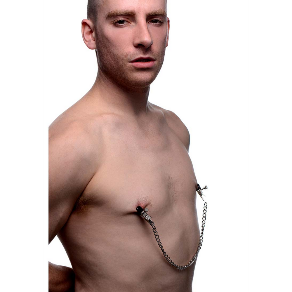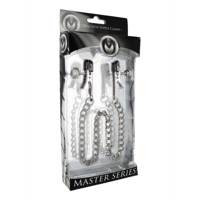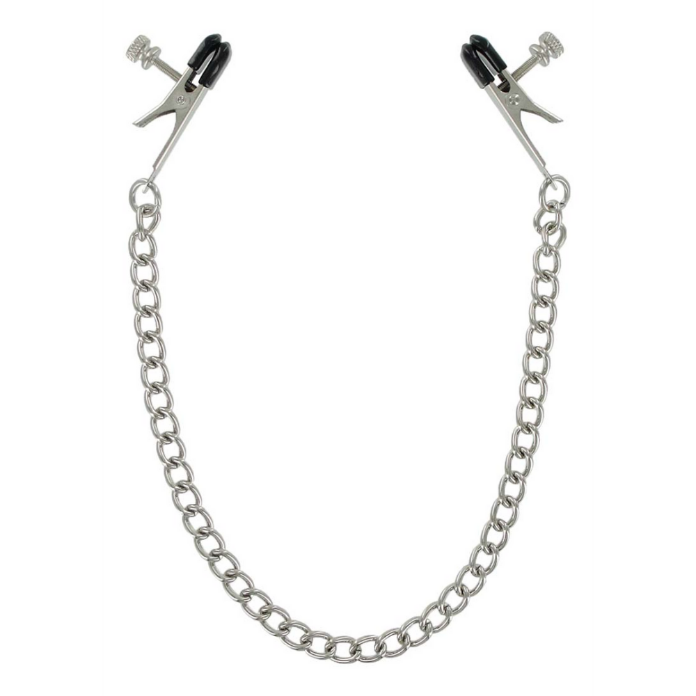 Bevestigd aan een enkele ketting, zodra deze bullnose-stijl klemmen zijn bevestigd aan de tepels van je speeltje, kun je precies bepalen hoeveel genot of pijn ze verdienen. Pas eenvoudig het niveau van intensiteit aan door de schroef nabij de punt van de klem te draaien. De uiteinden zijn bedekt met vinyl voor extra comfort en veiligheid. Afmetingen: 40 cm in totale lengte, de klem opent tot ongeveer 1,3 cm breed Materiaal: Staal en vinyl Kleur: Zilver