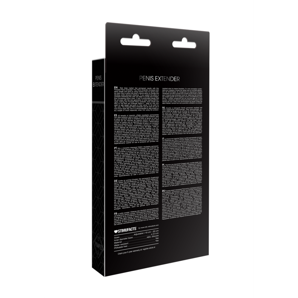 Grootte is belangrijk! Bereik permanent resultaat met deze opgepompte penisverlenger. Deze penisverlenger vergroot zowel de lengte als de omvang van de penis door tractie vanuit de verende stalen stangen ter ondersteuning van het natuurlijke vermogen van het lichaam om te veranderen en te ontwikkelen onder lichamelijke invloed. Als u uw penis onderwerpt aan voortdurend oprekken, gaan de cellen delen en vermenigvuldigen, waardoor de weefselmassa toeneemt. Hij heeft een comfortabel ontwerp voor alle maten met de nieuwe generatie technologie van schuifbelasting, waardoor deze opgepompte penisverlenger eenvoudig is en makke- lijker te gebruiken dan alle andere vergelijkbare apparaten. Ideaal voor mannen hun penis willen vergroten, qua lengte en qua omvang. Alleen te gebruiken door 18+. De opgepompte penisverlenger kan tot negen uur per dag gedragen worden, maar het wordt aanbevolen om iedere paar uur een pauze in te lassen, zeker als u het product voor het eerst gaat gebruiken.WAARSCHUWING: Lees de producthandleiding voordat u een vacuümpomp of cockring gebruikt. Stop onmiddellijk met het gebruik van de apparaten als u pijn of ongemak ervaart.