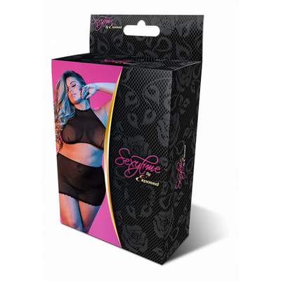 Van de Exposed by Magic Silk-collectie, deze stijl omvat: Een halter crop top met S-haaksluiting rond de nek en rug, en een bijpassende mini rok om aan te trekken.