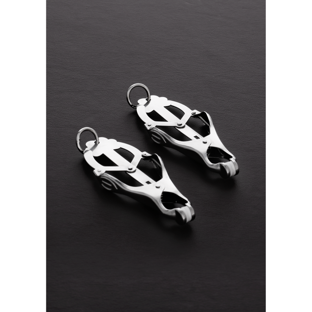 Stalen tepelklemmen met harde rubberen uiteinden. Deze klemmen zijn voorzien van een uniek Pull Tight-systeem dat wordt bediend door een kort touw. Hoe harder je aan het touw trekt, des strakker klemmen de klemmen. Als je eenmaal hard aan de touwen trekt, zijn ze bijna onmogelijk om van de tepels af te trekken. Een woord van waarschuwing - een deel van de pijn of gevoeligheid die tepelklemmen veroorzaken komt van het beperken van de bloedstroom naar de tepels, dus ze moeten niet te lang aan zitten. Ook wanneer ze worden verwijderd, kan de pijn erger zijn dan toen ze werden toegepast, dus wees er klaar voor.