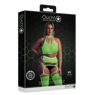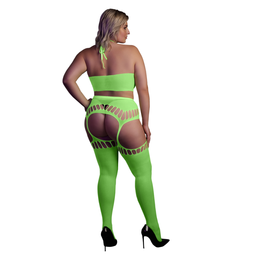 Our Neon lingerie is the perfect addition to your collection. Made with comfortable, easytofit, stretchy materials they are designed to fit your body perfectly. Whether you're using them as party wear or as lingerie, this eye-catching piece will make sure you stand out! Unleash your inner goddess with this stunning UV activated lingerie. This piece consist of a halter neck crop top and garter belt stockings. An amazing party-wear that gives you that wow-factor and makes you stand out. The UV activated materials adds a touch of mystery and allure. Easy to fit because of the stretchy materials will make you light up the night. Available in neon pink and neon green. Sizes run from XS/ XL to XL/XXXXL