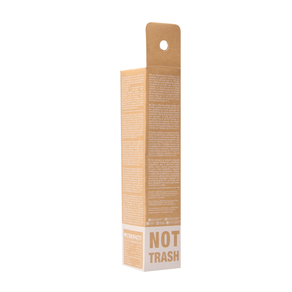 Met de introductie van ons merk NATURAL PLEASURE dragen we met een BIOLOGISCH AFBREEKBARE productlijn bij aan een minder verspilzuchtige omgeving. Al onze toestellen (behalve de motoren) zijn gemaakt van milieuvriendelijke, lichaamsveilige, 100% gerecycleerde biologisch gebaseerde kunststoffen. De verpakking is ook gemaakt van 100% gerecycleerd karton en papier. Ze zijn superglad, volledig niet-poreus, ftalaatvrij, latexvrij en geurloos. Wanneer ze worden weggegooid zullen deze producten op natuurlijke wijze worden afgebroken in een commerciële compostfabriek. Dankzij de gespikkelde, milieuvriendelijke uitstraling zal deze prachtige drager van Natural Pleasure zowel u als het milieu blij maken! Deze vibrator kan tot 7.200 duizelingwekkende omw/min bereiken wordt geleverd met een draaischakelaar die u naadloos door een verscheidenheid aan snelheden voert voor eindeloos plezier. De vibe gebruikt één AA-batterij die je tot 45 minuten orgasmespel kan opleveren.Het speeltje heeft een totale lengte van 14 cm (5,5), een inbrengbare lengte van 11 cm (4,4) met een diameter van 2,8 cm (1,1).