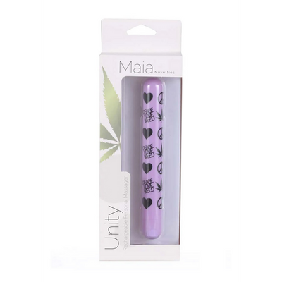 PEACE, LOVE and WEED. The Maia Novelties Unity makes a timeless statement with its modern design and nostalgic look. This 10-Function Rechargeable Bullet Vibrator is coated with silky soft Silicone that is 100% body safe. The PEACE, LOVE and WEED print design belies a soft yet powerful motor. The long, slender design allows for easy handling and multiple uses while the end position control button allows for easy speed change. Our Unity can also be used for bath time highs with its 100% submersible design.The Maia Novelties Unity measures 6 inches in length and is app. ¾ inches wide and includes a USB Charging Cable. All our rechargeable products include our 1-Year Replacement Warranty.
