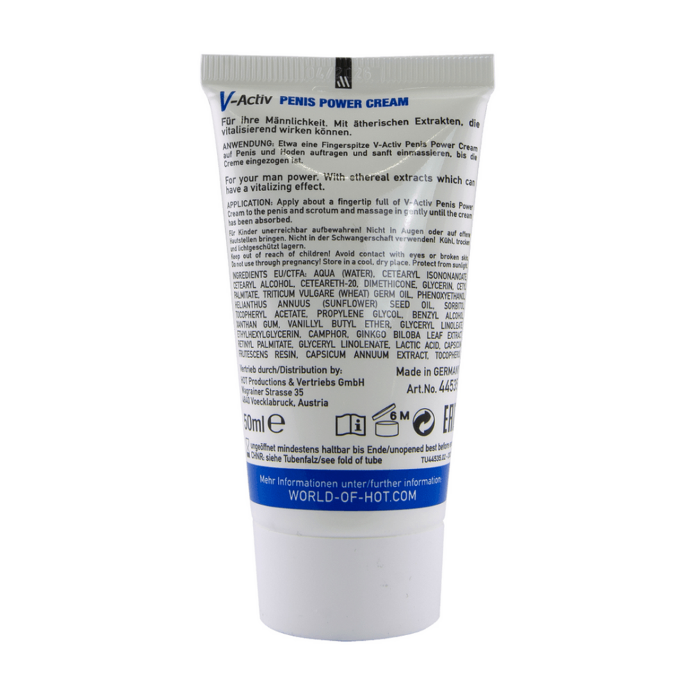 HOT V-ACTIV PENIS POWER CREAM Onderscheidt zich door zijn bijzondere combinatie van stimulerende bloedsomloop en verzorgende ingrediënten. Hoge kwaliteit Penis Power Cream Men kan uw prestaties een boost geven. Bij dagelijks gebruik kan deze crème positieve effecten hebben, zoals het verhogen van de vitaliteit en het welzijn. Masseer deze crème 's ochtends en 's avonds in. De V-aktiv Penis Power Cream kan ook direct voor een aangename doorbloeding van de penis zorgen. Breng aan op uw vingertop en masseer zachtjes in penis en testikels. Voorspel kan erg erotisch worden gemaakt als de partner de controle over het masseren overneemt. Bevat natuurlijk ginkgo-extract.