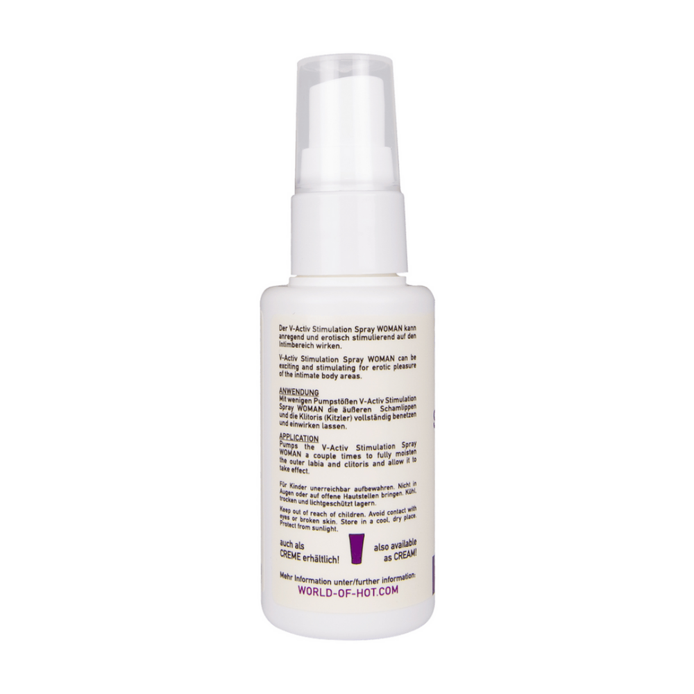 HETE V-ACTIV STIMULATIESPRAY voor vrouwen De V-ACTIV Stimulatiespray voor vrouwen is een spray van hoge kwaliteit speciaal voor erotisch genot. Opwindend en erotisch stimulerend effect. Met een paar pompjes maak je de buitenste schaamlippen en clitoris helemaal nat. Het voordeel van sprays is de gemakkelijke en hygiënische bediening en de snelle toepassing.