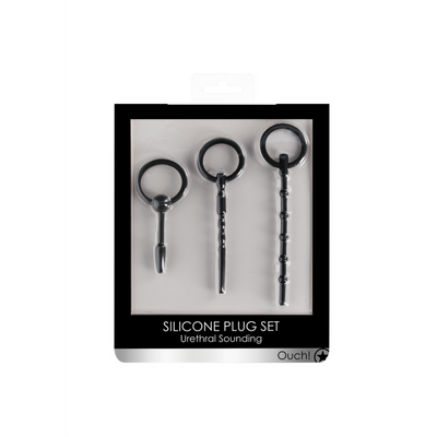 De OUCH! Urethral sounding Plug Set, bestaat uit 3 ftalaatvrije, soepele silicone dilators van hoge kwaliteit, die stapsgewijs gebruikt kunnen worden voor urethraal spel. Deze kan gebruikt worden om een immense stimulatie te creëren en om geleidelijk nieuwe genotssferen te verkennen. Deze eenvoudige dilators met textuur kunnen zorgen voor ongelooflijke sensaties en helpen met het opbouwen van sterke erecties en krachtige orgasmes. Ze zijn ideaal voor BDSM-spel en in het bijzonder om medische spelervaringen te creëren. Elke dilator heeft een andere maat en textuur voor extra sensatie en een soepele overgang van de ene maat naar de andere. Zie specificaties voor exacte maten op de doos. Je kunt de plug makkelijk verwijderen door je vinger door de ring te halen en te trekken. Waarschuwing: Als er niet zorgvouldig mee wordt omgegaan, kan het leiden tot irritatie, scheuren van de urethra, of tot een urinaire kanaalinfectie.