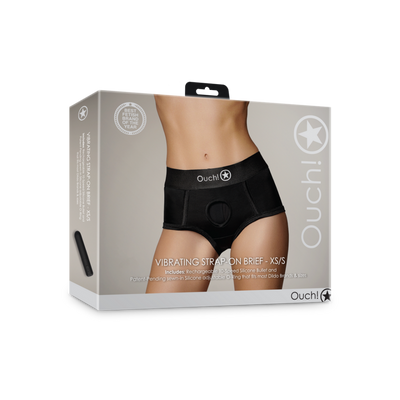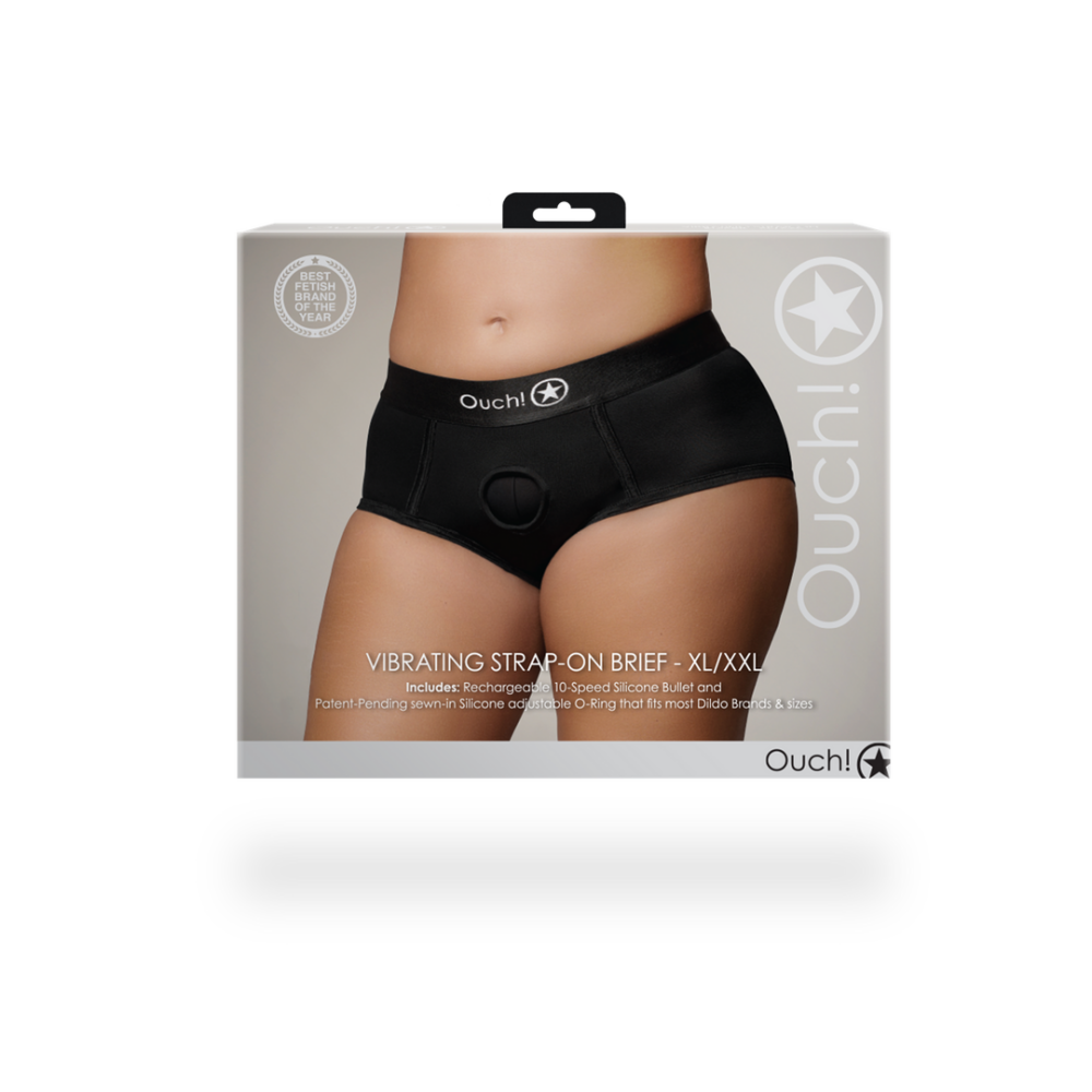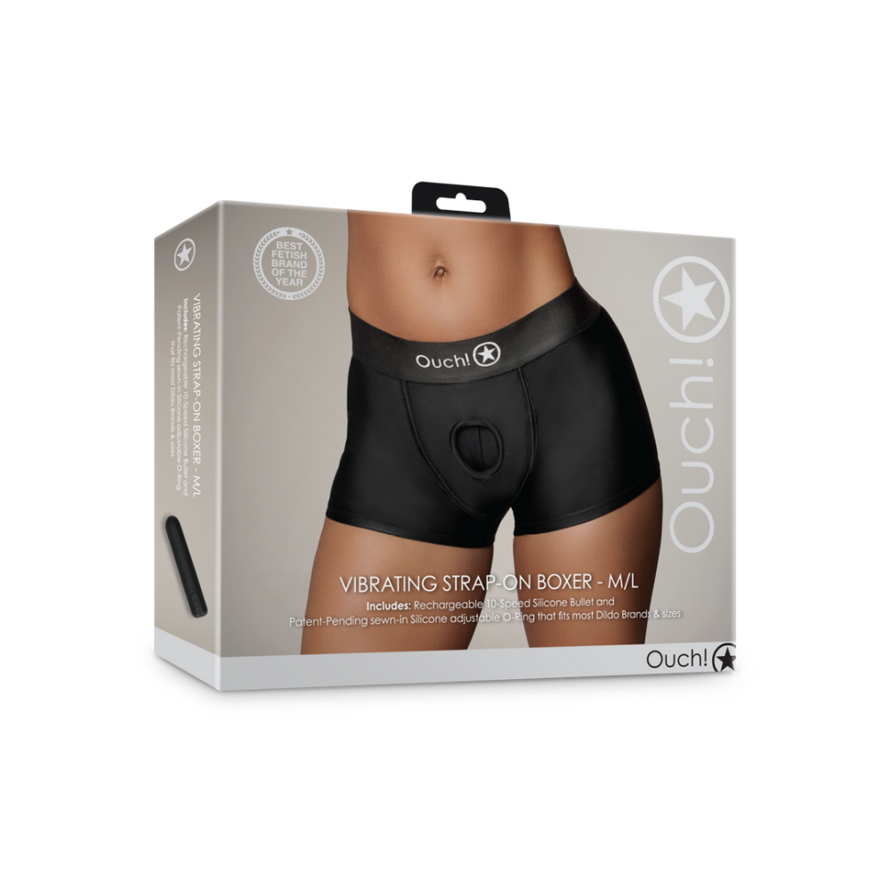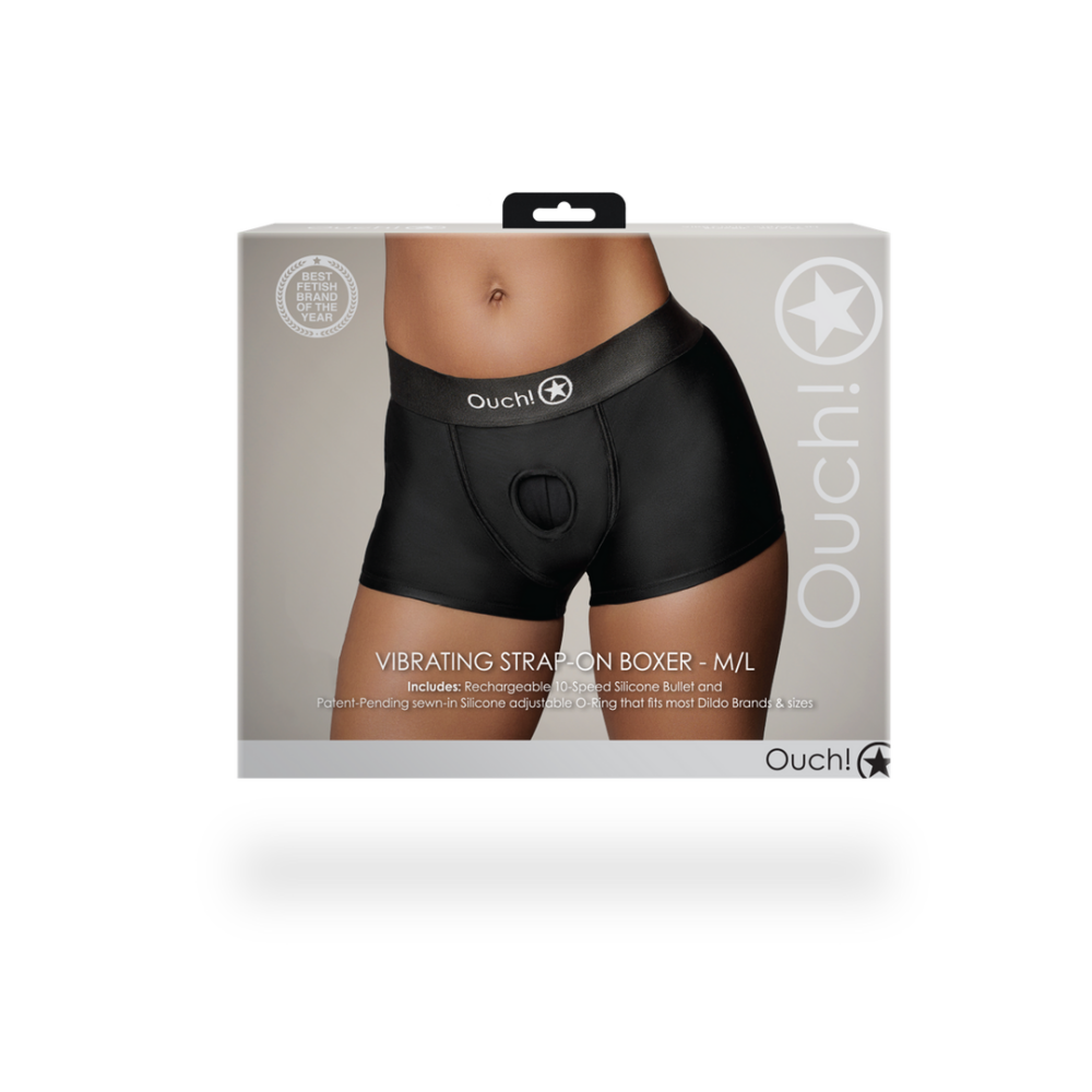 De vibrerende strap-on boxer heeft een elegant design, met een langer broekspijpje. Simpel en elegant, deze strap-on onderbroekjes zijn perfect voor jou en je partner. Maak je geen zorgen over gecompliceerde bandjes en klipjes, trek het broekje aan, voeg een toy toe en geniet. Met een groot aantal verschillende stijlen, vormen en maten, is er voor iedereen de perfecte pasvorm. Door het unieke O-ring systeem, passen bijna alle dildo’s in de strap-on broekjes, zonder hulp van extra O-ringen. Bij elk broekje zit een premium kwaliteit, silicone, her-oplaadbare, 10-functie vibrerende bullet voor extra sensaties voor jou en je partner. Het broekje is gemaakt van hoogwaardig elastisch compressiemateriaal voor een betere pasvorm, comfort en gebruikersduur. De lichtgewicht ademende stof zal vocht van het lichaam afvoeren en ervoor zorgen dat je koel blijft, when things get hot. Perfect voor packing, peggen en penetratie. Verkrijgbaar in de maten XS/S, M/L, XL/XXL. 1 jaar garantie. Past perfect bij alle Ouch! RealRock Dildo’s Dongs.