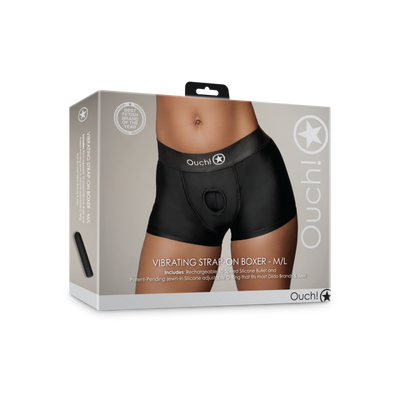De vibrerende strap-on boxer heeft een elegant design, met een langer broekspijpje. Simpel en elegant, deze strap-on onderbroekjes zijn perfect voor jou en je partner. Maak je geen zorgen over gecompliceerde bandjes en klipjes, trek het broekje aan, voeg een toy toe en geniet. Met een groot aantal verschillende stijlen, vormen en maten, is er voor iedereen de perfecte pasvorm. Door het unieke O-ring systeem, passen bijna alle dildo's in de strap-on broekjes, zonder hulp van extra O-ringen. Bij elk broekje zit een premium kwaliteit, silicone, her-oplaadbare, 10-functie vibrerende bullet voor extra sensaties voor jou en je partner. Het broekje is gemaakt van hoogwaardig elastisch compressiemateriaal voor een betere pasvorm, comfort en gebruikersduur. De lichtgewicht ademende stof zal vocht van het lichaam afvoeren en ervoor zorgen dat je koel blijft, when things get hot. Perfect voor packing, peggen en penetratie. Verkrijgbaar in de maten XS/S, M/L, XL/XXL. 1 jaar garantie. Past perfect bij alle Ouch! RealRock Dildo's Dongs.