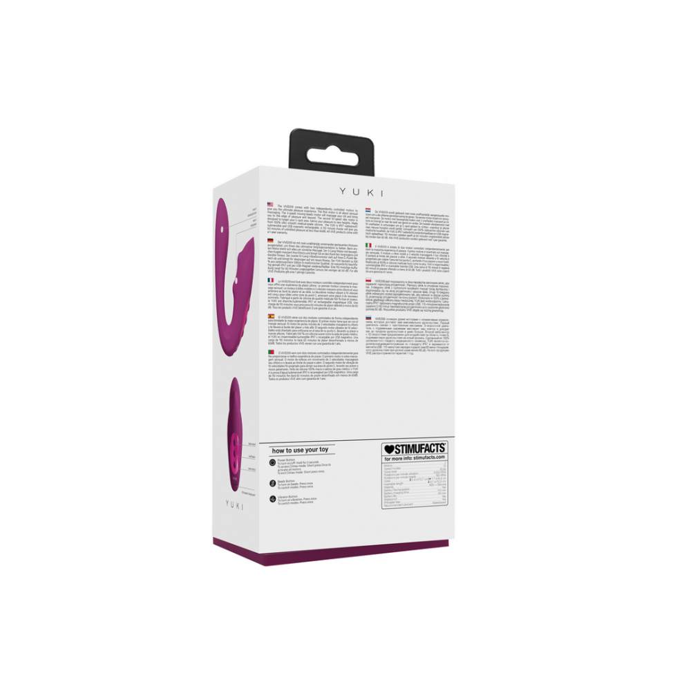 The VIVE059 comes with two independently controlled motors to give you the ultimate pleasure experience. The first motor is all about sensual massaging. The 3-speed moving-beads motor will massage your clit and bring you to the edge of pleasure and beyond. The second 10-speed vibe motor is designed to target your G-spot area, taking your pleasure to new heights. Made from 100% silky smooth medical-grade silicone, the YUKI is IPX7 waterproof/submersible and USB magnetic rechargeable. A 110-minute charge will give you 60 minutes of unbridled pleasure at less than 60dB. All VIVE products come with a 1-year warranty.