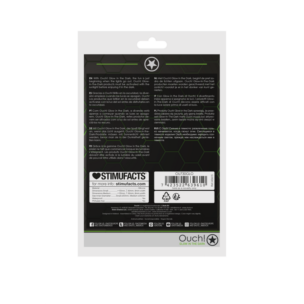 Ouch! Glow in the Dark, de toekomst van bondage is hier. Het design heeft het autentiek bondage uiterlijk, maar brengt licht in het duister door zijn fluoresecrende groene details waardoor alles een feest wordt. Deze penisring bevat twee ringen die comfortabel en rekbaar zijn. De ringen verbeteren je seksuele daden en brengen vele mogelijkheden met zich mee door de flexibiliteit. Ouch! Glow-In-The-Dark producten moeten worden geactiveerd met het zonlicht voordat je er in het donker van kunt genieten.