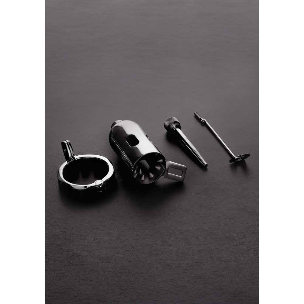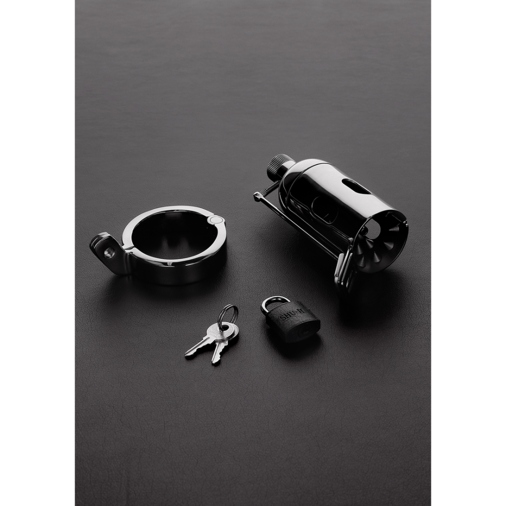 Of je die penis nu in een time-out of levenslang in de gevangenis zet, deze elegante roestvrijstalen kuisheidskooi zal je controle en de hulpeloosheid van je partners bevestigen. Er worden drie verschillende maten O-ringen meegeleverd om een comfortabele of oncomfortabele pasvorm te vinden, afhankelijk van wat uw slaaf verdient. Het meest unieke kenmerk van dit apparaat is echter het interne sluitsysteem. Steek de sleutel in het koperen sleutelgat en draai om het slot recht te trekken. Het slot kan dan in het scharnier worden gestoken. Met nog een draai aan de sleutel blijft je slaaf machteloos en gevangen totdat je besluit hem vrij te laten... als die dag ooit komt!