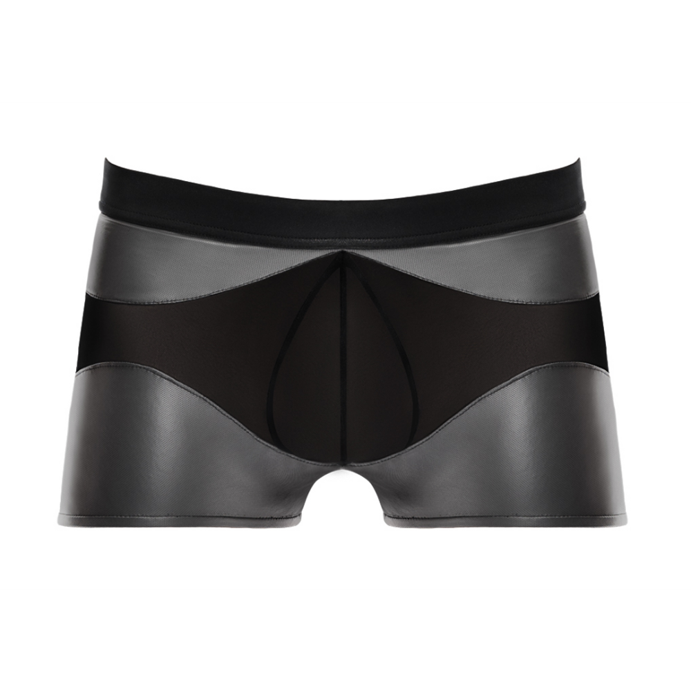 Van de Zip It-collectie van Male Power, deze stijl omvat: een short met een gevormde pouch met een diagonale pouch-rits met een beschermende flap en een slank, nat-look tailleband.