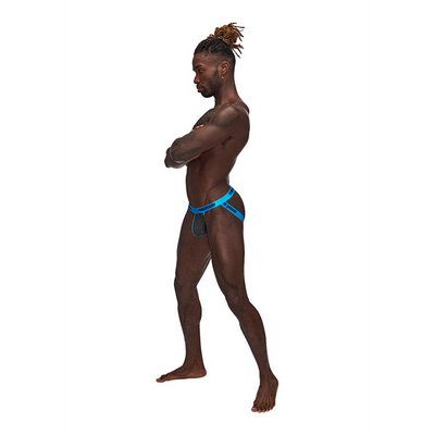 Van de Galactic-collectie van Male Power, de Strappy Ring Jock heeft een comfortabele elastische band die is bevestigd aan twee metalen ringen aan de achterkant, een contoured pouch aan de voorkant voor extra comfort en een ultra-pluche ton-sur-ton gegraveerde tailleband.
