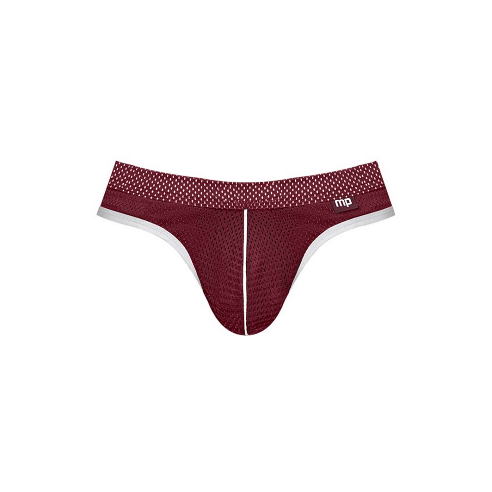From the Sport Mesh collection by Male Power, the Sport Jock, features a stay put fabric covered waistband with a logo'd MP tag. Plush elastane sporty striping highlights the front, and rear leg bands. Full rear exposure.