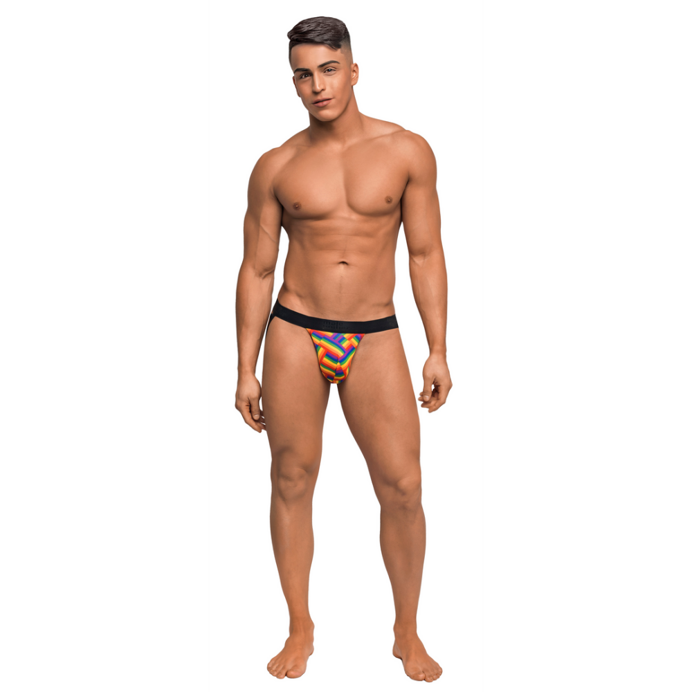 Uit de Pride Fest-collectie van Male Power, deze stijl omvat: Een jock met een lage taille en ondersteunende pouch, een zachte ton-sur-ton geperforeerde elastische tailleband en zachte elastische beenbanden.