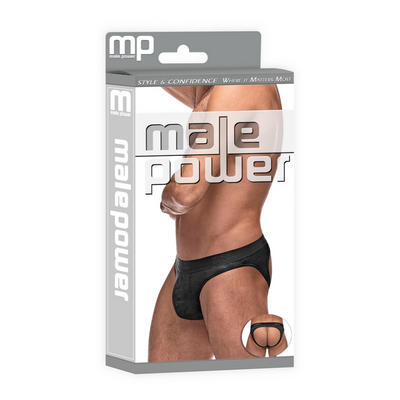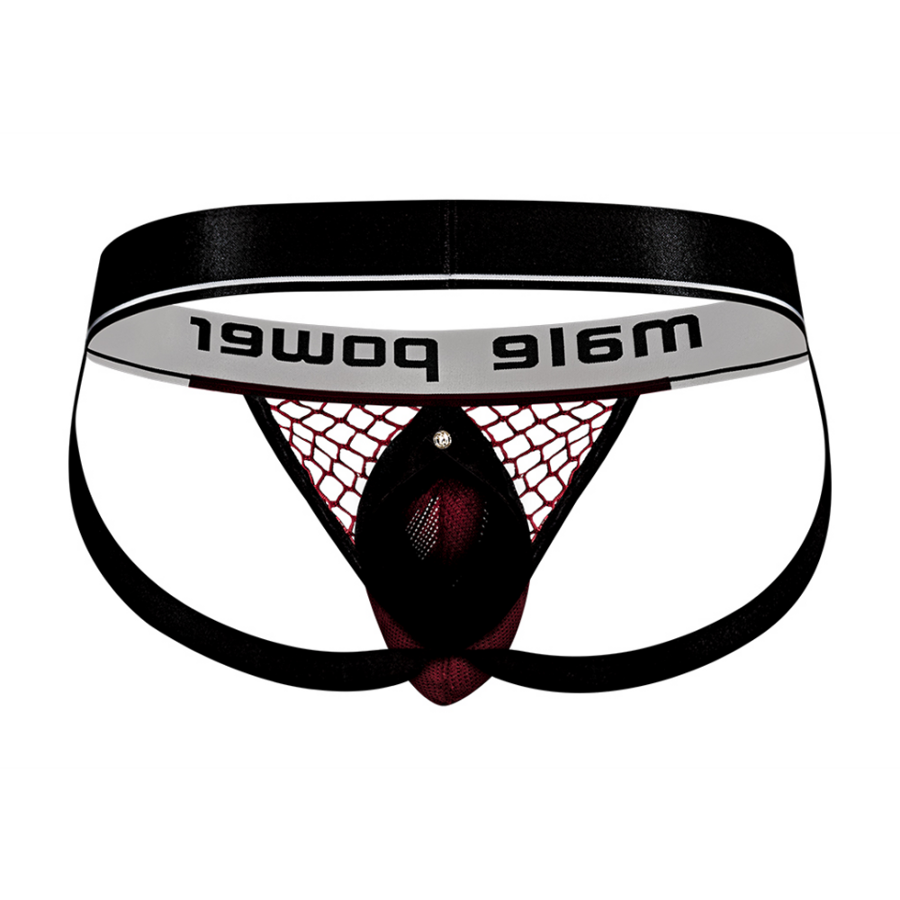 Van de Cock Pit Net-collectie van Male Power, deze stijl omvat: Een Cock Ring Jock met een afneembare snap-off pouch die een zachte elastische C-ring onthult, zachte elastische beenbanden en bies, en een satijnen afgewerkte branded tailleband.