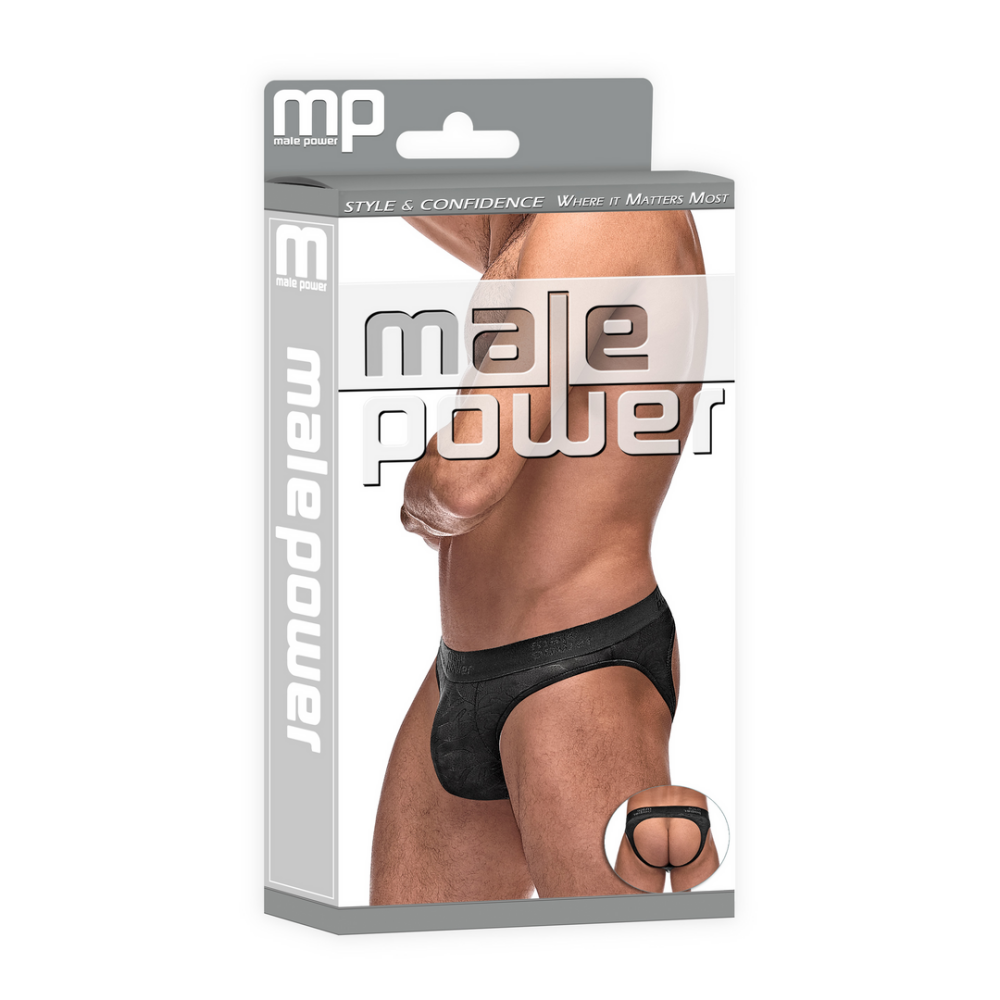 Van de Liquid Onyx-collectie van Male Power, deze stijl omvat: Een moonshine met een klassieke pouch, uitgesneden achterkant en ton-sur-ton pluche elastische afwerking.