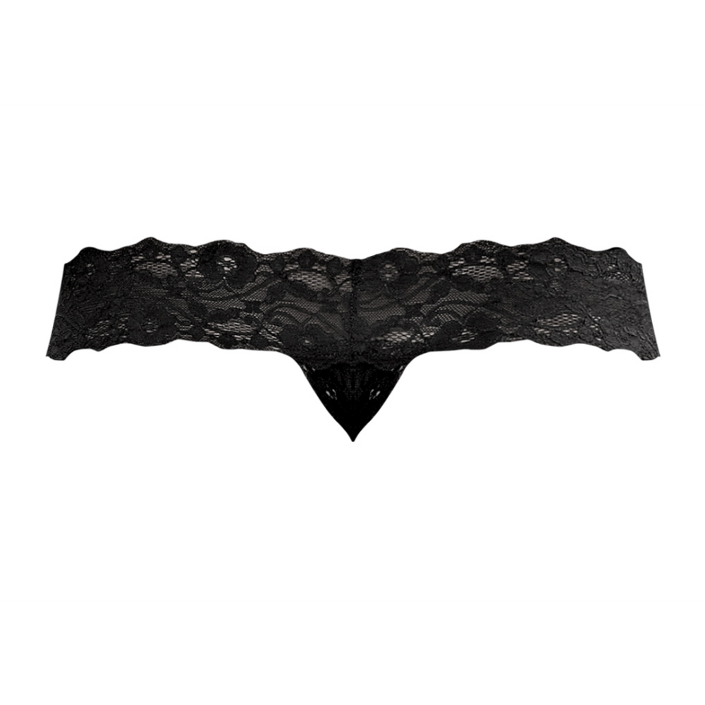 Van de Scandal-Lace collectie van Male Power, deze stijl omvat: Een micro thong met een mesh pouch met cire afwerking, een brede bloemenkant tailleband en een geplooide kant thong achterkant.
