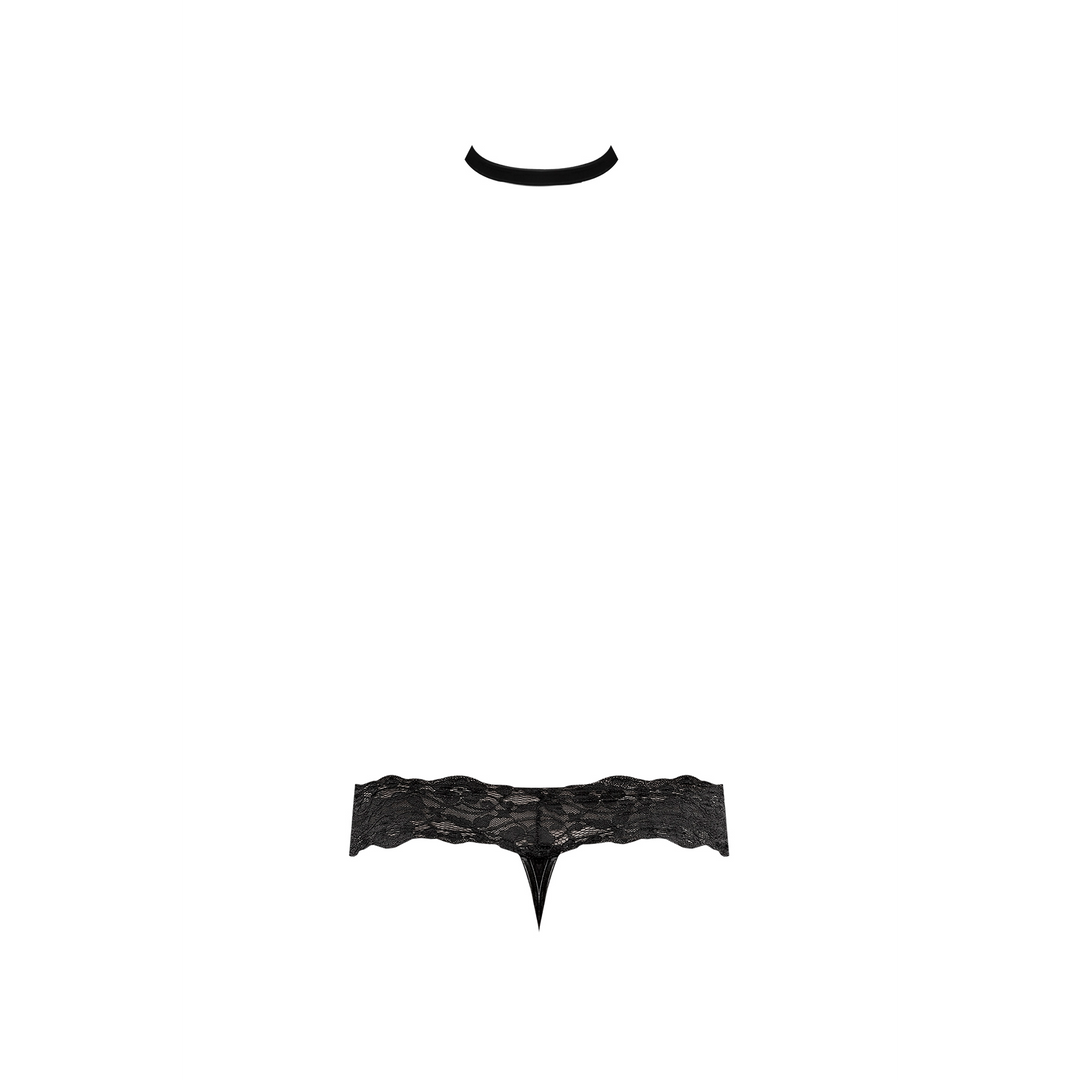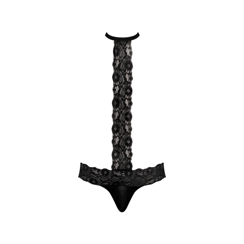 Van de Scandal-Lace collectie van Male Power, deze stijl omvat: een choker thong met een mesh zakje, een micro thong achterkant en een brede bloemenkant tailleband met een bevestigde voor T-band die is bevestigd aan een velcro cire choker.