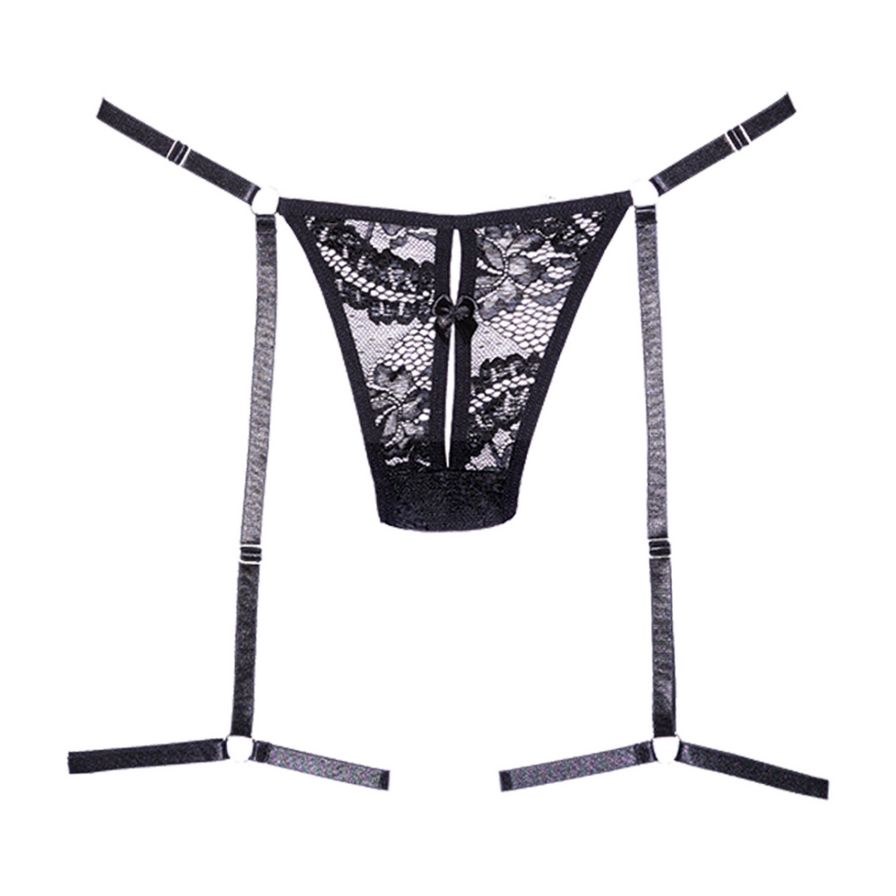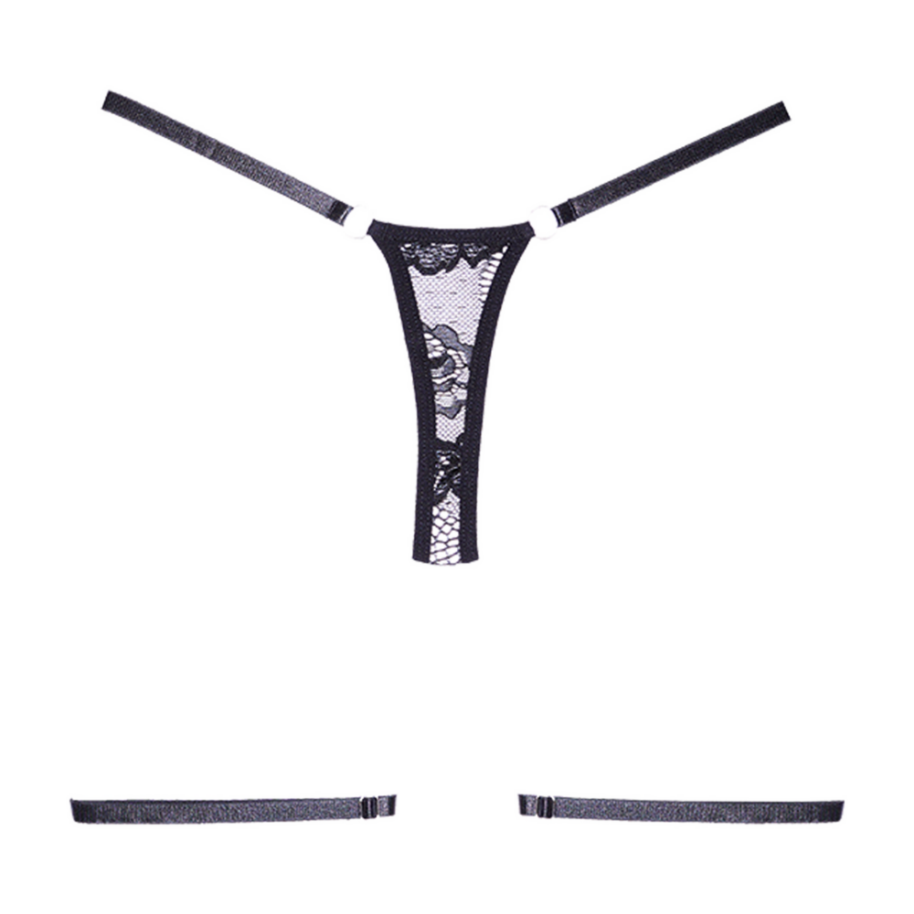 Wanneer je helemaal wilt gaan en absoluut prachtig wilt zijn… Open voorkant slip met kanten thong achterkant, versierd met zilveren ringen. Verstelbare sliders op de zijkanten, beenbanden en beenbandjes.