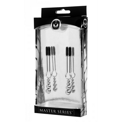 Dit zijn geen gewone tepelklemmen! Ontworpen naar het klassieke, pijnlijke klaverklemmen, hebben deze een extra twist! Niet alleen neemt de druk toe wanneer je aan de lange ketting van 30 cm trekt… Ze hebben ook spikes van rubber die in de huid graven en je een extra beet van genot en pijn geven! Gemaakt van nikkelvrij metaal zijn ze perfect voor degenen die intense tepelstimulatie willen en een gevoelige huid hebben. Om schoon te maken, gebruik je eenvoudig warm water en milde zeep en laat je de ketting en klemmen daarin weken. Voor grondigere reiniging gebruik je een combinatie van alcohol en water. Spray na elke speelsessie met een speelgoedreiniger voor de zekerheid en houd ze bij de hand of stop ze in je speeltas om wat spice aan elke scène toe te voegen! Nadat je je onderdanige partner hebt opgewarmd, pak je de klemmen. Je wrijft over de tepels om ze wakker te maken en steviger te laten worden. Dan knijp je in de tepel, trek je deze van de borst weg en klem je de uiteinden van de klaverklem net achter de tepel, op de tepelhof. Je laat het langzaam, heel langzaam los zodat de druk opbouwt en ze niet geschokt worden. Dan laat je de klem langzaam los zodat ze het extra gewicht van de metalen klem kunnen voelen en de spikes in hun huid kunnen voelen graven. Je herinnert ze eraan om te ademen, laat ze kalmeren en centreren, en doet dan hetzelfde aan de andere kant. Je speelt met hen zoals gebruikelijk, voegt lichte klappen toe en trekt aan hun haar, gebruikt een Wartenberg-wiel over hun huid en geselt hen. Dan, na ongeveer 30 minuten of minder, laat je de klemmen los en geniet je van de uitdrukking op hun gezicht en hun kreet van pijn terwijl het bloed weer terugstroomt, waardoor de zintuigen in hun tepels opnieuw worden wakker geschud! Afmetingen: Klemmen: 8,9 cm lengte x 3,8 cm breedte. Ketting: 30 cm lengte. Klemmen openen tot 1,3 cm breed. Materialen: Metaal, rubber Kleur: Zilver Belangrijkste Kenmerken: Intense Druk: Deze klaverklemmen staan bekend om hun stevige grip en blijven langer zitten dan de meeste! Spiked Rubber Tips: De spikes van rubber voegen meer stimulatie en sensatie toe! 30 Cm Ketting: De ketting houdt ze altijd bij elkaar en voegt ook extra druk toe aan de klemmen wanneer deze worden getrokken. Nikkelvrij Metaal: Al het metaal is nikkelvrij en veilig voor het lichaam voor degenen met een gevoelige huid.