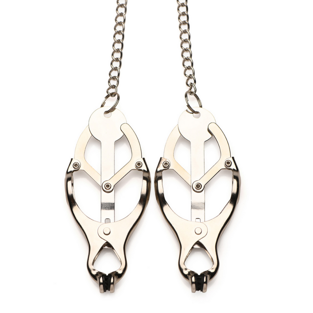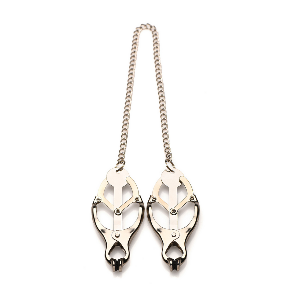 p>Voeg een nieuw niveau van intensiteit en pijn toe aan je tepelspel met deze Tyrant spiked clover clamps! De meest intense van onze collectie, deze Japanse Clover clamps intensiveren alleen maar in druk naarmate je eraan trekt of er gewichten aan toevoegt! In plaats van een zachte, platte of gevoerde klem, hebben deze ronde, spitse, metalen klemmen die echt in de tepels en areola bijten! Geniet van het toevoegen van wat spice aan je pijn-en-plezier spel! Het metaal kan verwarmd of gekoeld worden als onderdeel van een temperatuurspel. Om schoon te maken, gebruik warm water en milde zeep, spoel daarna af met water en dep droog. Al het metaal is nikkelvrij voor gevoelige huid./p>p>br>/p>p> Nadat je je onderdanige partner hebt opgewarmd, pak je de klemmen. Je wrijft over de tepels om ze wakker te maken en steviger te laten worden. Dan knijp je in de tepel, trek je deze van de borst weg en klem je de uiteinden van de clover clamp net achter de tepel, op de areola. Je laat langzaam, heel langzaam los zodat de druk opbouwt en ze niet geschokt worden. Dan laat je langzaam de klem los zodat ze het extra gewicht van de metalen klem kunnen voelen en de spitse punten kunnen voelen indringen. Je herinnert ze eraan om te ademen, laat ze kalmeren en centreren, en doet dan hetzelfde aan de andere kant. Je speelt met ze zoals gebruikelijk, voegt lichte klappen en het trekken aan hun haar toe, gebruikt een Wartenberg wiel over hun huid en geselt ze. Dan, na ongeveer 30 minuten of minder, laat je de klemmen los en geniet je van de uitdrukking op hun gezicht en hun kreet van pijn terwijl het bloed weer terugstroomt, waardoor de zintuigen in hun tepels opnieuw worden wakker!/p>p>br>/p>p>Afmetingen:br>Klemmen: 8,9 cm lang x 3,8 cm breed.br>Ketting: 37,5 cm lang.br>Klemmen openen tot 0,6 cm breed./p>