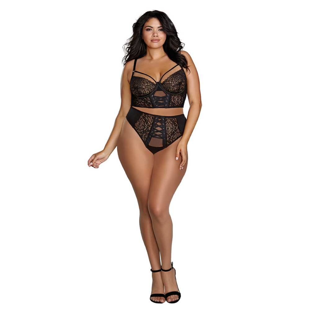 Stretch mesh and stretch galloon lace bustier. Front boning. Lace-up detail with sheer mesh backing. Silver grommets and rings. Adjustable straps. Hook and eye back closure with 3 adjustments. Matching stretch mesh and stretch galloon lace-up thong panty