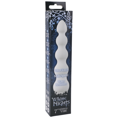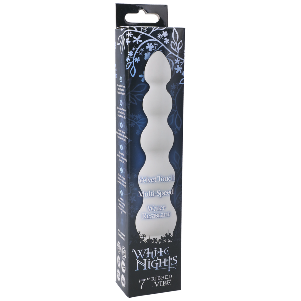 Ben je klaar voor het ultieme in extase? De White Nights 7 Ribbed Vibe biedt krachtige multi-speed sensaties voor clitorisstimulatie, G-Spot genot en anale spel. Deze vibrator is majestueus lang en geribbeld, en gemaakt van luxueus velvet touch materiaal. De White Nights Ribbed Vibe zal je dienen waar je maar wilt hij is waterdicht en praktisch stil, zelfs op volle kracht! Verwen jezelf in decadente nachten!